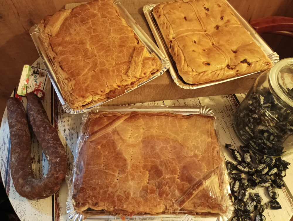 Empanadas artesanas elaboradas con masa de hojaldre o masa de pan, de aproximadamente 1 kg por unidad. Disponibles desde 14,00 €/kg y en una amplia variedad de sabores como atún, jamón y queso, picadillo, lomo con picadillo y queso, cecina de León con queso de cabra y mermelada de pimiento, champiñones con queso y bacón, entre otros.